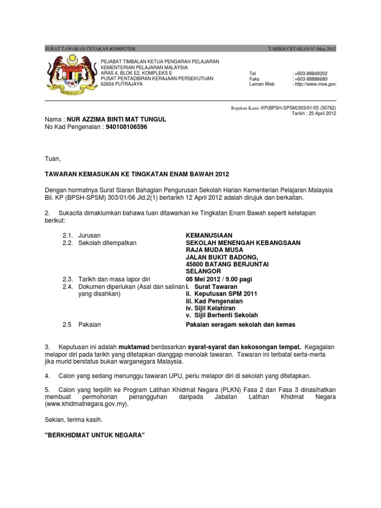 Contoh Surat Tawaran Tingkatan 6