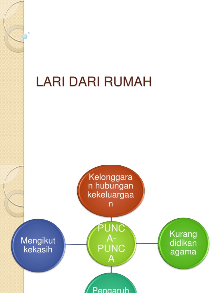 Masalah remaja lari dari rumah mendapat liputan meluas media massaHuraikan punca-punca remaja lari dari rumah. Punca-punca Remaja Lari Dari Rumah Hubungan kekeluargaan yang kurang baik Masyarakat kini lebih bersifat materialistik. Mereka merupakan tunggak serta harapan negara dalam mencorakkan dan mewarnakan hala tuju negara demi merealisasikan visi dan misi Wawasan 2020.